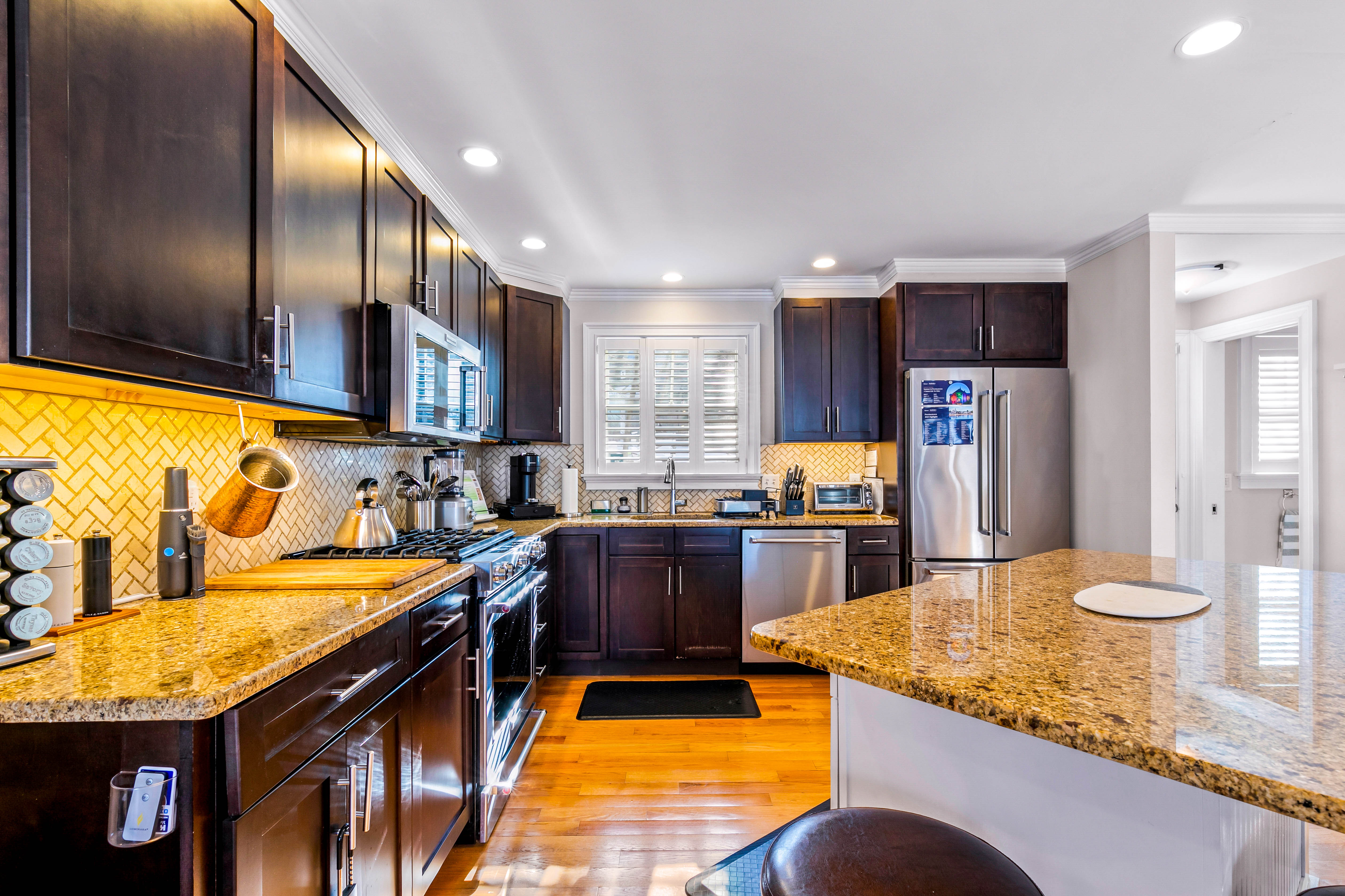 Outside, enjoy a fenced patio oasis with a bar and heaters, ideal for year-round lounging and entertaining.